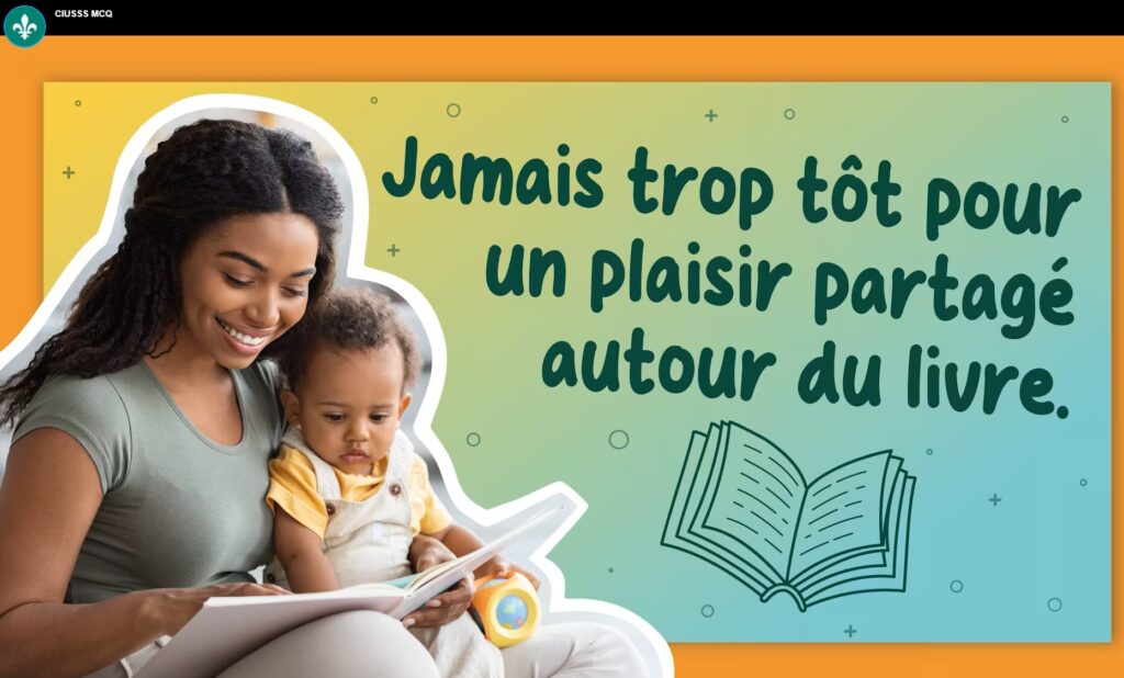 Destinée aux parents et aux adultes jouant un rôle significatif auprès de jeunes enfants âgés entre 0 et 3 ans, l’initiative Jamais trop tôt pour un plaisir partagé autour du livre propose des stratégies pour initier les tout-petits aux livres. Un signet et une affiche sur l’éveil aux livres sont aussi téléchargeables.